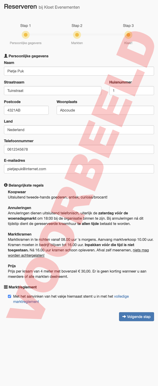 Naam, straatnaam, huisnummer, postcode, woonplaats, telefoonnummer en email-adres. U kunt reserveren zonder e-mailadres, maar als u een bevestiging van uw reserving wilt ontvangen dan is een e-mailadres noodzakelijk.